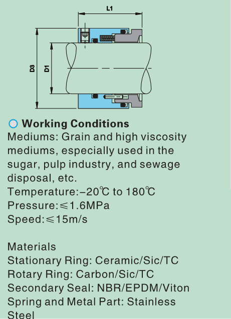 產(chǎn)品說明:材料: 靜環(huán):Ceramic/ Sic/ TC 動環(huán):Carbon/ Sic/ TC 輔助密封:NBR/ EPDM/ Viton 彈簧及金屬件:不銹鋼