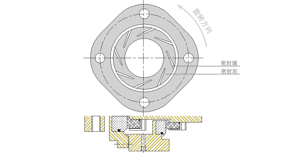 開槽的密封面,分為兩個(gè)功能區(qū),外區(qū)域和內(nèi)區(qū)域,氣體進(jìn)入開槽的外區(qū)域這些槽將壓縮進(jìn)入的氣體,在槽根部形成局部的高壓區(qū),使端面分開,并形成一定厚度的氣膜,為了獲得必要的泵送效應(yīng),動(dòng)壓槽必須開在高壓側(cè)。開槽的密封間隙內(nèi)的壓力增加對(duì)干氣密封的工作是至關(guān)重要的,它將保證即使在軸向載荷較大的情況下,密封也能形成一個(gè)不被破壞的穩(wěn)定氣膜。密封的內(nèi)區(qū)域(即壩區(qū)) 是平面的,靠它的節(jié)流作用而限制了泄量。密封工作時(shí)端面氣膜形成的開啟力與由彈簧和介質(zhì)作用力形成的閉合力達(dá)到平衡,從而實(shí)現(xiàn)了非接觸運(yùn)轉(zhuǎn)。干氣密封的彈簧力是很小的。主要目的是當(dāng)密封不受壓或不工作時(shí)能確保密封的閉合,防止意外發(fā)生。